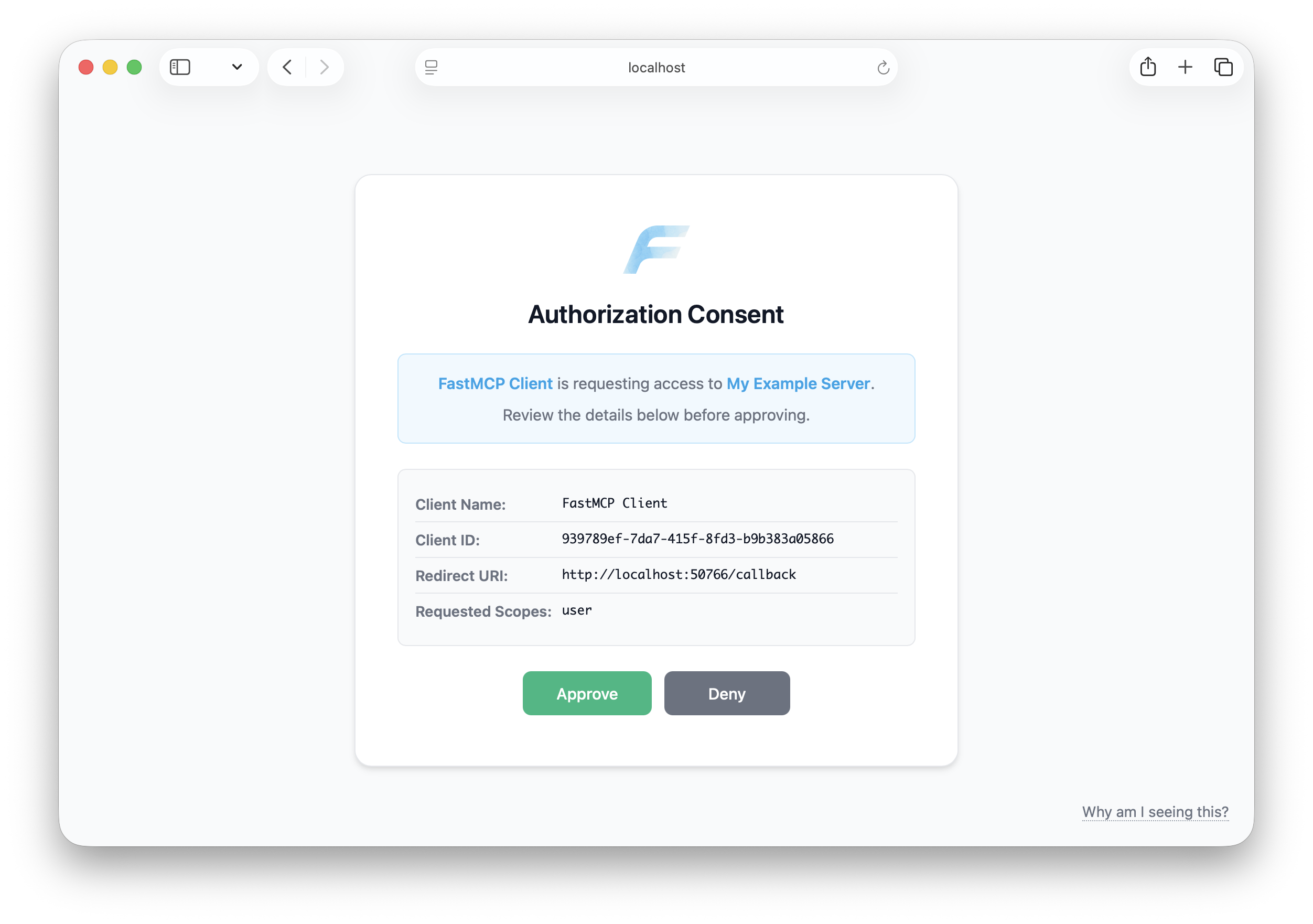 FastMCP’s OAuth proxy requires you to explicitly consent whenever any new or unrecognized client attempts to connect to your server. Before any authorization happens, you see a consent page showing the client’s details, redirect URI, and requested scopes. This gives you the opportunity to review and deny suspicious requests. Once you approve a client, it’s remembered so you don’t see the consent page again for that client. The consent mechanism is implemented with CSRF tokens and cryptographically signed cookies to prevent tampering.